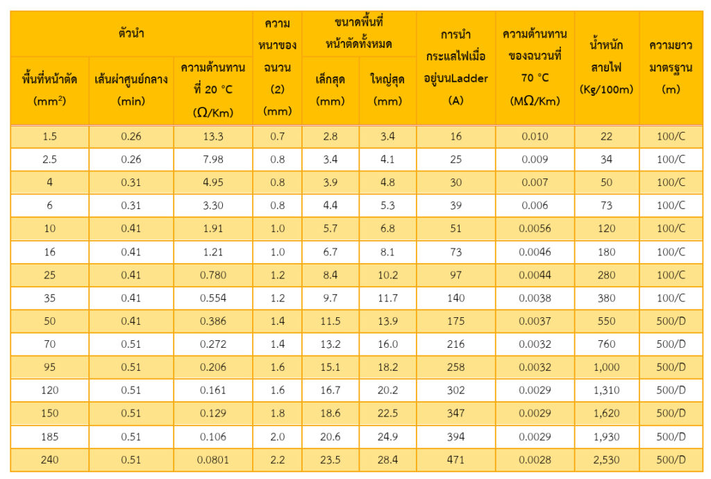 ขนาดตัวนำ : 1.5,2.5,4,6,10,16,25,35,50,70,95,120,150,185,240 mm2