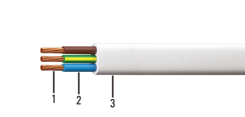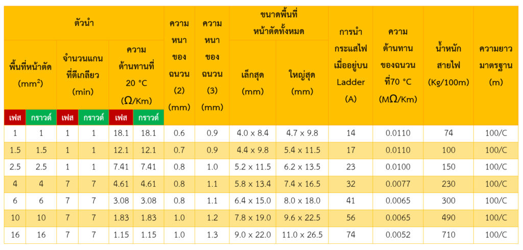 - ฉนวนกันความร้อน : PVC (สีฟ้า,สีน้ำตาล,สายกราวด์สีเขียว/เหลือง)